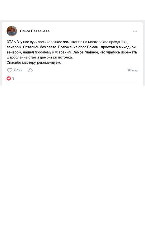 ОТЗЫВ: у нас сучилось короткое замыкание на мартовские праздники, вечером. Остались без света. Положение спас Роман - приехал в выходной вечером, нашел проблему и устранил. Самое главное, что удалось избежать штробление стен и демонтаж потолка.